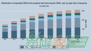 CDM項(xiàng)目中仍有很大的供給潛力,導(dǎo)致國際碳信用供需仍然不平衡。根據(jù)UNFCCC網(wǎng)站的預(yù)測,僅預(yù)測已經(jīng)簽發(fā)的2,584個(gè)項(xiàng)目在2020年前的可簽發(fā)量就超過30億噸,如下圖所示,其中來源可再生能源項(xiàng)目的CER增長明顯。若加上未簽發(fā)項(xiàng)目,潛在的供應(yīng)量更加驚人。
